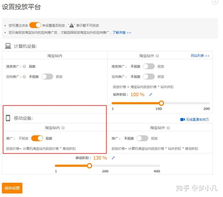 b设置投放平台,淘宝站外不投放,(站外流量不精准)站内投放 移动关键词出价比 120%;