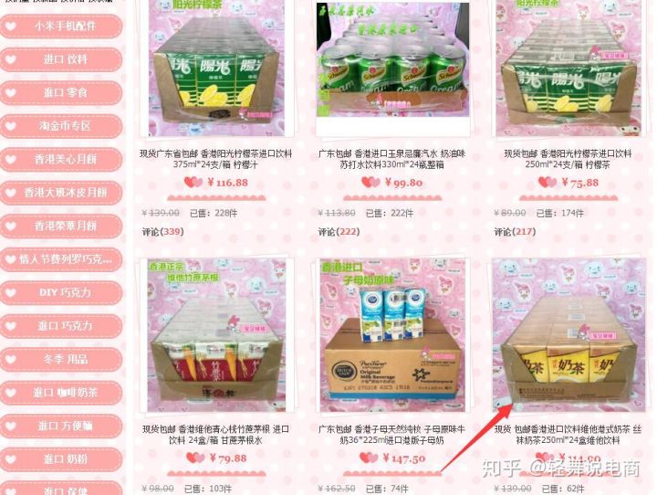 我们不需要他们来评价我们店铺装修,觉得我们装修得多么地可爱对不对,我们只需用户来购买我们的产品。我们可以看到这样的一个店铺。所有的背景都是非常卡通的一个粉红色少女心的一个背景后。让我们看看去是不是很不协调,一个奶茶产品,然后放一个粉红色的一个背景,这样的装修是非常的不协调的。还有这样的一个产品的背景图片作为主图,在产品排名和点击上是没有任何优势的。