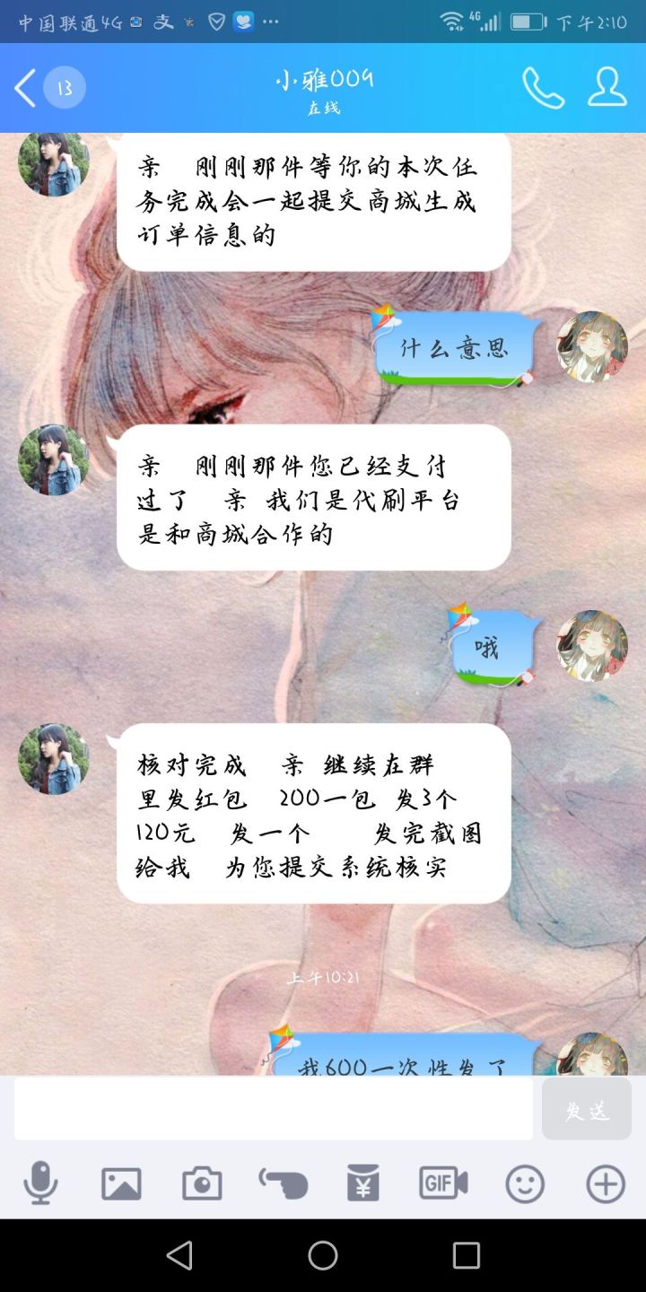 起因是楼主昨天凌晨收到一则短信,邀我加一个QQ然后进行淘宝刷单。因为楼主身边也有人做这个,当时也就没多想。加了QQ后,那人给我普及一大堆刷单“知识”,现在想想都是屁话。然后给楼主两种任务选择,一种十单,一种二十单。楼主选了十单。ta又给我一个宝贝链接,让我扫码进入一个微信群,把钱以红包形式发到群里。因为是三个单子一起做的,价格不菲, 楼主很快就没钱了。然而那人只给我佣金(就一点),说本金得任务全部做完才还回来。当时博主脑子被狗吃了,只想快点做完把钱都拿回来〒_〒借钱的时候才被家人点醒