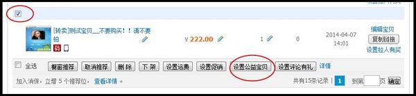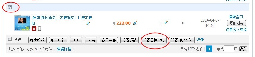 1、请卖家在“出售中的宝贝”勾选想加入公益宝贝计划的宝贝,然后点击“设置公益宝贝”按钮: