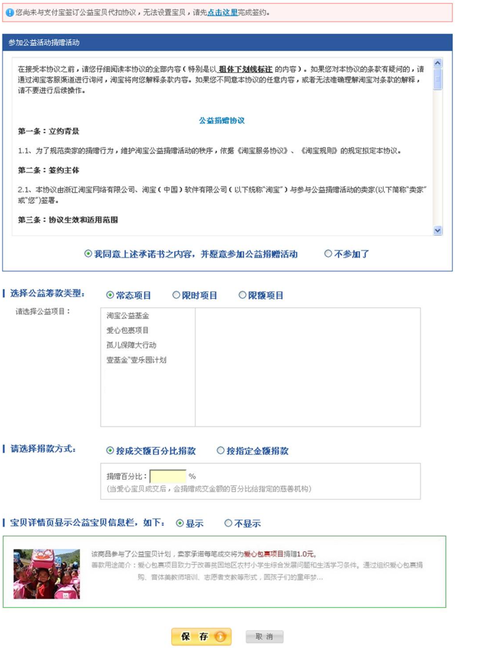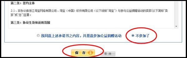我本人作为卖家,自愿参加淘宝公益捐赠活动,承诺遵守淘宝网商品发布管理规则。