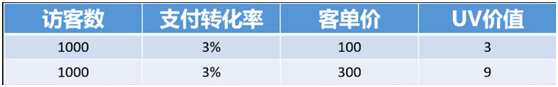 假设两个卖类似产品的店铺,每天都有一千访客,A店铺的客单价是100元,B店铺的客单价是300元,两家店铺转化率相同,都是3%,可以分别计算出两家店铺的UV价值。A店是3元,B店是9元。