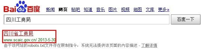 首先,请您打开百度:http://www. 再搜索框里面输入:“ 四川工商局 ” 点击搜索,点击搜索结果第一个网站就是四川工商局官网!