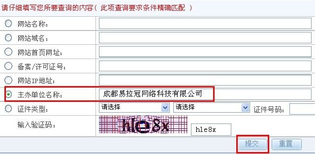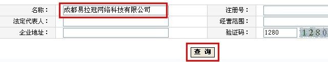 点击进入后,输入我们易店无忧的运营公司:成都易拉冠网络科技有限公司,输入验证码后点击【查询】按钮,如下图: