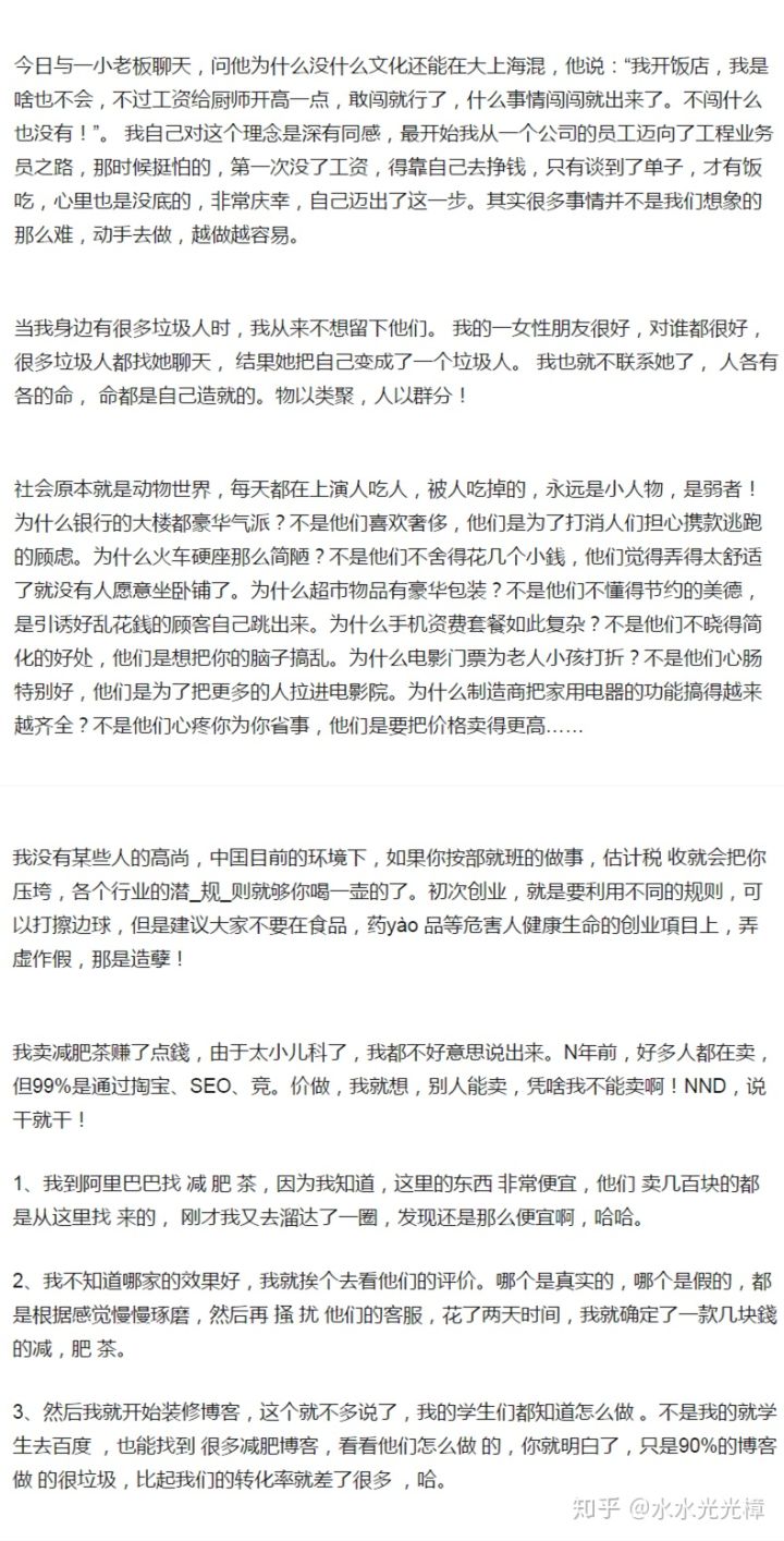 我卖减肥茶赚了点錢,由于太小儿科了,我都不好意思说出来。N年前,好多人都在卖,但99%是通过掏宝、SEO、竞。价做,我就想,别人能卖,凭啥我不能卖啊!NND,说干就干!