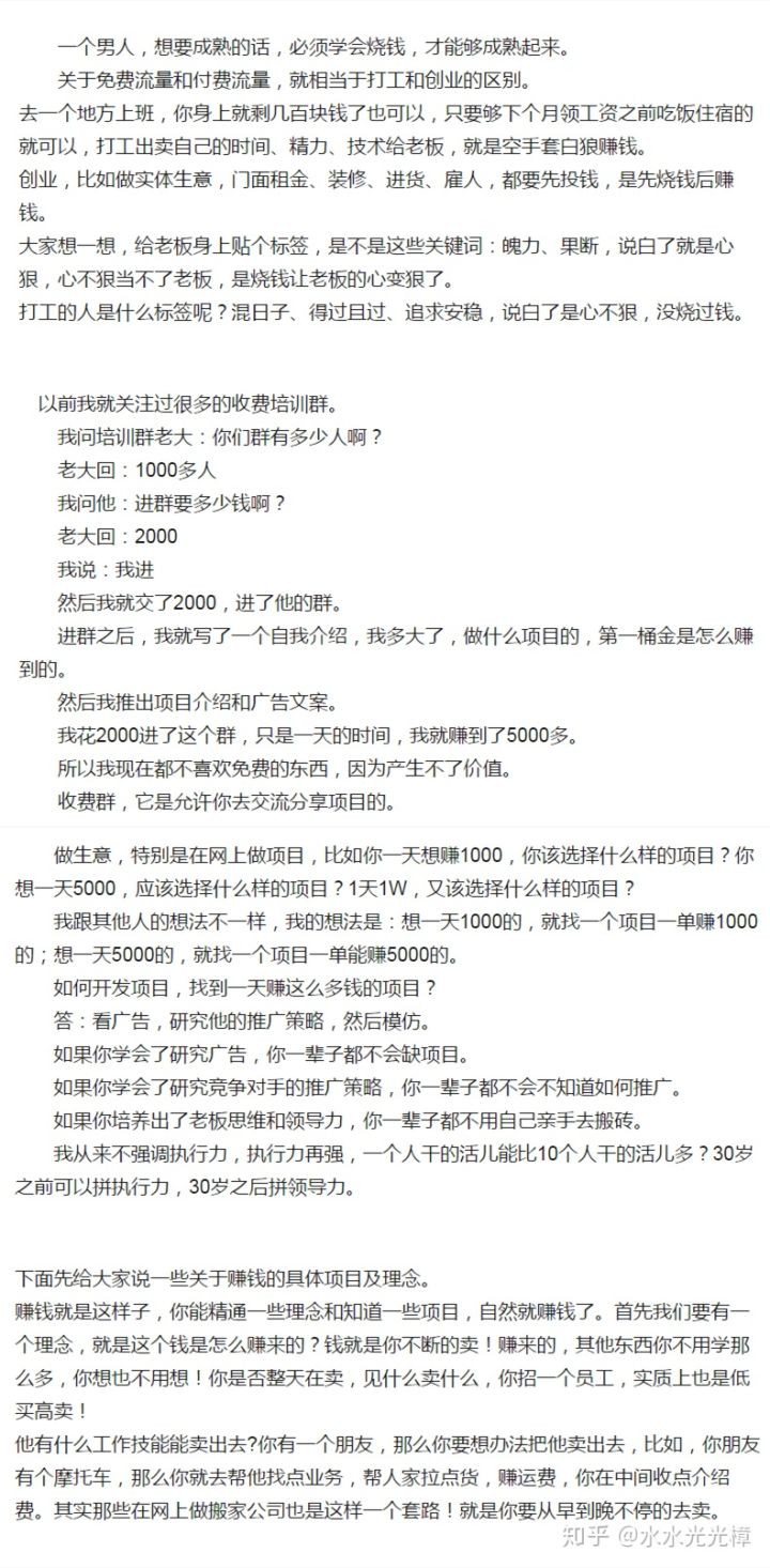 这一点没必要过多解释,别人走过的路,咱们没必要再费时间走一遍。学养猪学挖掘机都要交学费拜师,更何况是创业赚钱。都说跟着zhu席当bu长,想一个月挣十万,你去跟着一个月挣几千块的叼丝讲师学习肯定不合适,最快捷的方式就是去看看一个月挣十几萬的人怎样做的。百闻不如一见,百见不如一干,最好能近身观察,把这个人操作项目的所有细节都观察清楚并亲自实践验证。