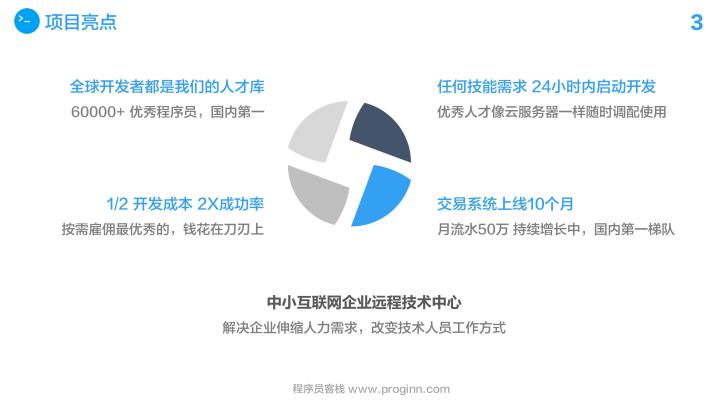 这部分一般包括的内容有:你的项目背景和项目概况,一定要讲清楚你具体要做什么,语言尽量简洁、凝练。此外,在这部分你还需描述自己项目的投资亮点和融资需求,提前告知投资人你的投资价值及你对的资金需求。
