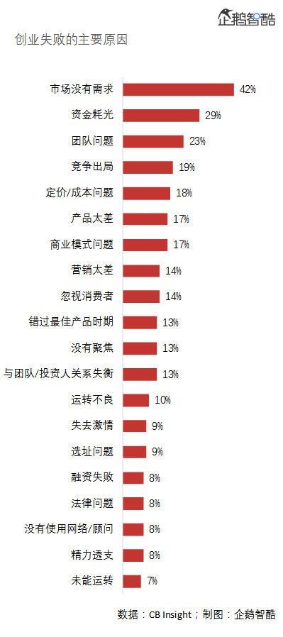 2014年市场研究机构CB Insight收集了100多家创业公司的失败案例,总结出了创业公司失败最常见的20条原因