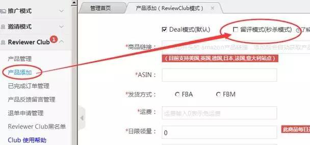 操作入口:Reviewer Club — 产品添加 —留评模式