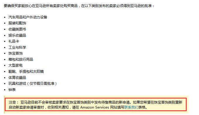 亚马逊产品上架有分类审核制度(Categories and Products Requiring Approbal),有些品类产品只有审核通过后才可以在亚马逊平台上进行销售。随着中国卖家的不断入驻,亚马逊会逐渐对某些商品类目进行收缩和严格把控,有些产品会提高其入驻门槛要求, 以亚马逊北美站的珠宝为例,如下图所示,目前亚马逊暂时不会审核卖家要求在珠宝首饰类别中发布待售商品的新申请。