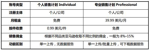 如上图所示,亚马逊账户类型有如下两种:专业销售计划(Professional)和个人销售计划(Individual),这两种计划的主要区别在于费用结构,和功能使用权限上。以美国市场为例,我们从上表可以清晰地看到,“个人销售计划”会被收取按件收费的费用,而“专业销售计划”账户则需要支付月度的订阅费。