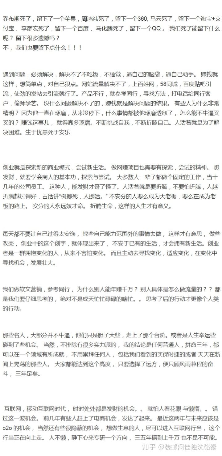 人类社会的基本规律,一个社会中注定有99%都是穷人,放在当今世界哪个囯家都一样。如果像大多数人一样思考问题,注定只能得到跟大多数人一样的结果。比如已经确定某个項目是可以賺錢的前提下,你做了一段时间没挣到钱,那么你会怎样想呢?多数人怀疑項目,放弃。少数人怀疑自己,放弃。只有极少数人怀疑自己的同时,拼尽一切努力找到差距,不断改进自己,那麽最后坚持下来的这极少数人,显然就是能賺到錢那部分人。做項目的目的不是为了证明这个項目不挣钱,而是要努力成为賺钱的那一小部分人,这样说不知道大家明不明白。