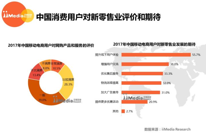 iiMedia Research(艾媒咨询)数据显示,当前用户对网购体验持满意态度的占比为38.8%,整体网购体验仍有较大上升空间。在未来有待改善的方面,提升线下用户体验成为移动电商用户最大的期待,比例为55.7%。艾媒咨询分析师认为,实体店产品的展示与技术、设计相结合成为增强用户体验的有益之举,有助于增强新零售业的用户粘性。