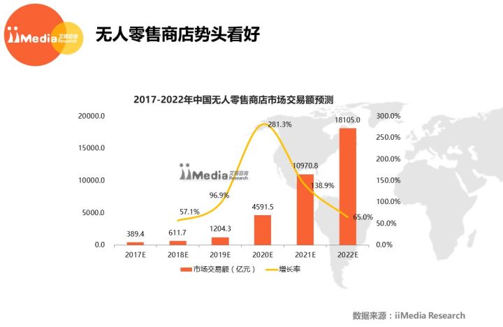 iiMedia Research(艾媒咨询)数据显示,2017年无人零售商店交易额预计达389.4亿元,未来五年无人零售商店将会迎来发展红利期,2020年预计增长率可达281.3%,至2022年市场交易额将超1.8万亿元。艾媒咨询分析师认为,无人零售商店有解放人力和时间成本的优势,被各大电商平台及知名品牌所认可。但无人零售商店进一步发展的关键在于技术与信用体系的健全完善。