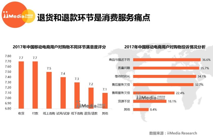 iiMedia Research(艾媒咨询)数据显示,消费用户对付款和收货环节评价最好,均为7.70分,而退货和退款则相对较低,为7.20分。用户投诉情况显示,商品与描述不符和质量问题是构成用户对商品售后环节满意度不高的两大主要原因。艾媒咨询分析师认为,售后服务优化成为制约优化消费体验的短板,而新零售购物方式更应在这一环节优化服务以增强用户粘性。
