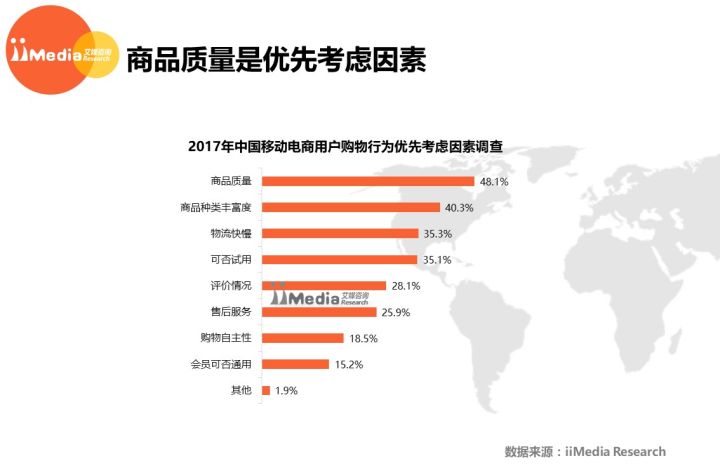 iiMedia Research(艾媒咨询)数据显示,在移动电商用户网购优先考虑因素分布中,商品质量成为用户最重要的考虑因素,占比48.1%;此外,商品种类丰富度、物流快慢等因素也受消费用户重视。艾媒咨询分析师认为,产品质量始终是吸引消费用户与增强其消费信心的重要基础,同时,优化服务和产品体验也成为移动电商用户对新零售业的期待。