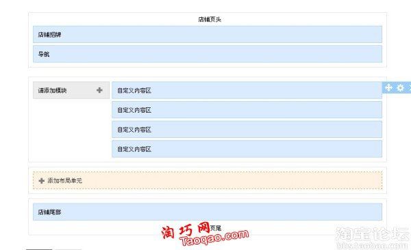 第二步:到你的基础版网店中,把左侧190宽的全部删除,添加右边750宽的一个自定义内容区域。
