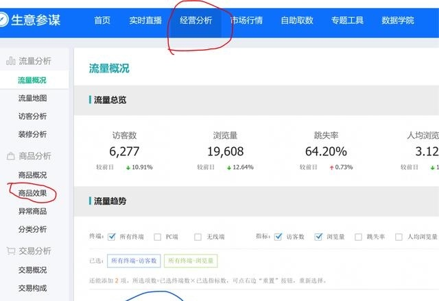 首先,打开“生意参谋-经营分析-商品效果”,如下图: