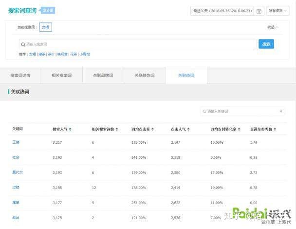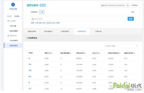 通过数据分析不难看出女裙的搜索人气太大,在新店初期肯定是很难获得展现,所以我们在做标题的时候,要保持我们标题初期的核心产品词搜索人气不要太大 。如果过大就添加属性词去降低热度 。通过分析生意参谋中的关键热词,关联修饰词,将女裙加入相应的属性词来降低核心词的热度。