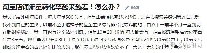 我买了站外引流插件,每天流量500以上,但是店铺转化率越来越低,现在去搜索关键词我连自己都找不到自己的宝贝,以前不至于这样子的甚至宝贝综合排名比较靠前的,自双十一前半个月一直到现在都很惨淡的。我一直也有这个站外引流,但是10月20号以前每天都会有一定自然流量整店转化率百分之3左右。现在每天只有0.3!!!甚至挂蛋!请问我应该怎么办?淘宝客也没以前给力了,以前我店铺成交淘宝客的占比还是比较大的,现在怎么想办法…
