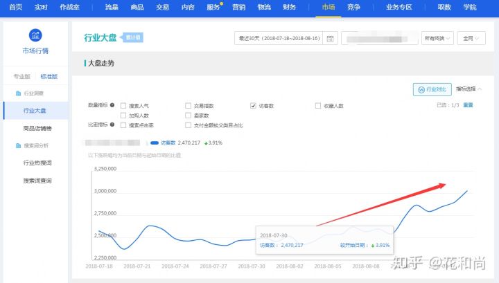 比如现在8月底的时候,夏装行情会逐渐往下的,这个时候夏装或者整个夏季性产品的转化自然也是下滑的,所以也不用太过于紧张,定制了市场行情的小伙伴可以在生意参谋-市场-行业大盘中,观察行业情况。