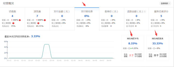 2.因为你是一个新店,必定是很少流量的,所以在这段时间里,不要追求访客数和浏览量的大小,不要到处发帖求访问,这样进来的流量跟垃圾流量无异,要注重的是支付转化率(以下是一个无打理的新店的生意参谋截图)