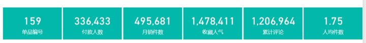 虽然产品只有159个,但整体数据量不小,全部付款人数、月销件数、收藏人气、累计评论,甚至连人均件数都可以看得到。