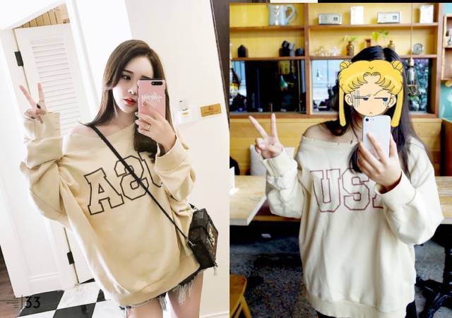 尴尬无比的狗啃领卫衣。正常穿领子太大,露肩的话领子又太小。