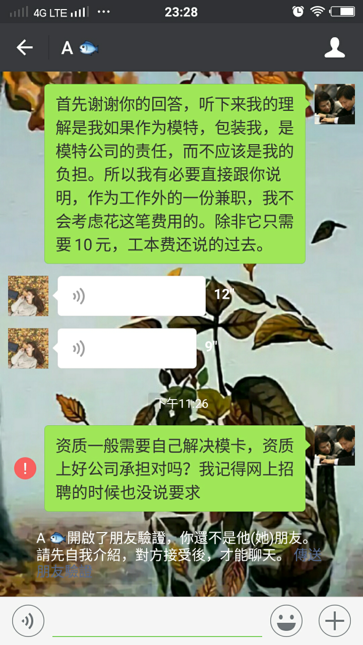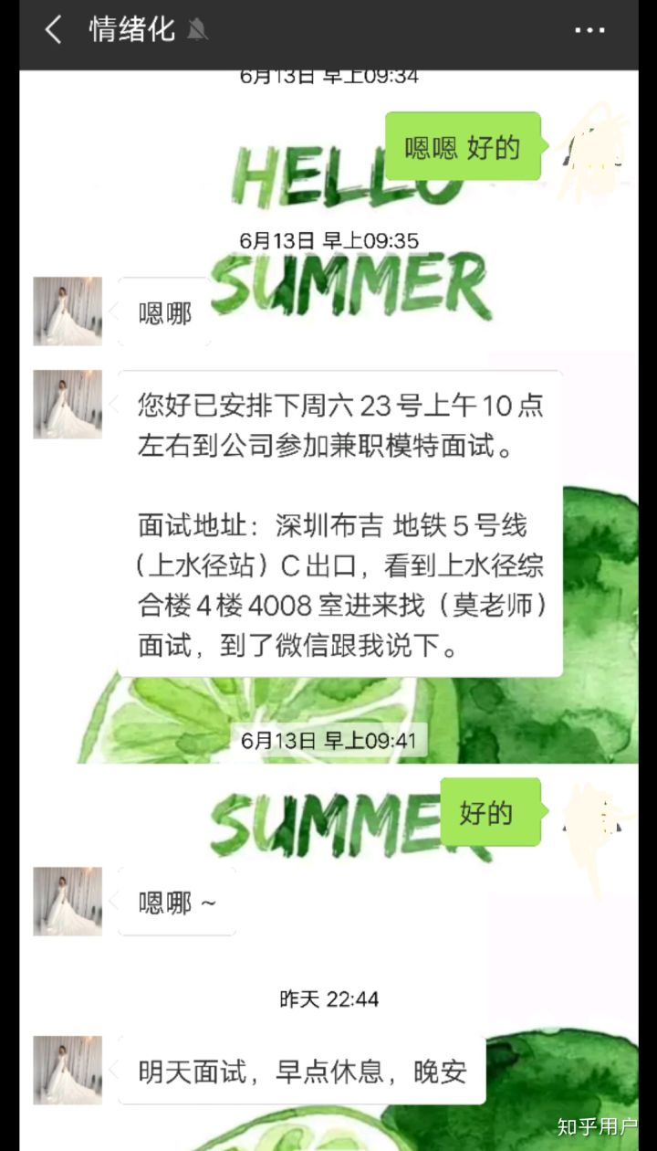 加了那些联系人,他们问我是否要做模特,我是好是的,让我报身高体重名字联系电话住址私人生活照等等。在这提供之前我跟说明了我的情况,我只做兼职还有就是结算为日结算等常见也应该知道的问题。我报上去那些资料,他们说我形象不错,长得很漂亮,其实漂亮不漂亮我自己都知道,然后给我安排面试时间。