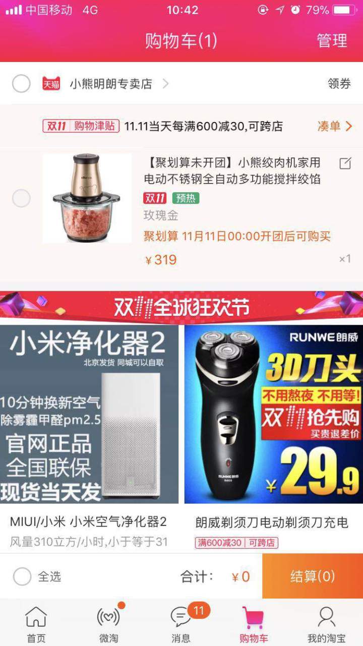 他说双十一卖119哦 你购物车里的319是厂商指导价 你要买一个优惠券 有了这个就可以在双十一119 没有的话就是149……………………………………..