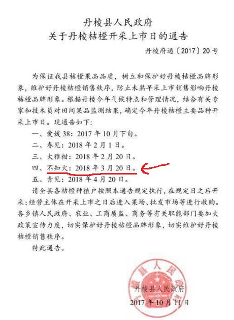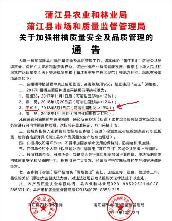 我不太会操作知乎,我不知怎样在提问的时候上传照片,我就自己回答补充两张图。四川省丹棱县和蒲江县是不知火主要产区,这两地政府都发通告要求不知火3月份才能采摘。