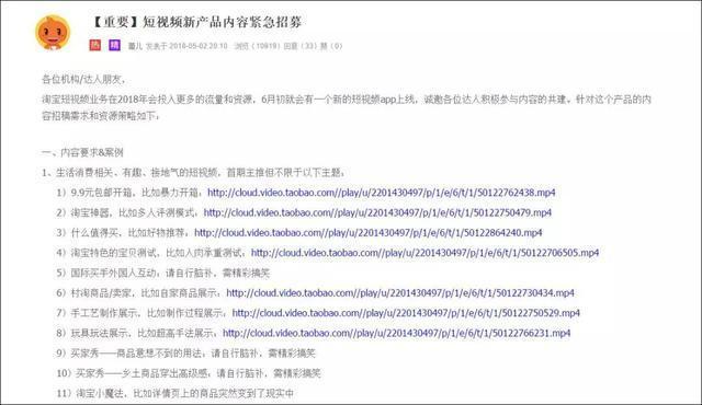 5 月初,淘宝短视频官方就在淘宝论坛发布了主题为《短视频新产品内容紧急招募》的帖子,相关招募公告显示,短视频“鹿刻”app主要招募的内容包括9. 9 元包邮开箱、淘宝神器、什么值得买、买家秀等 11 种类别,并要求“生活消费相关、有趣、接地气的短视频”。