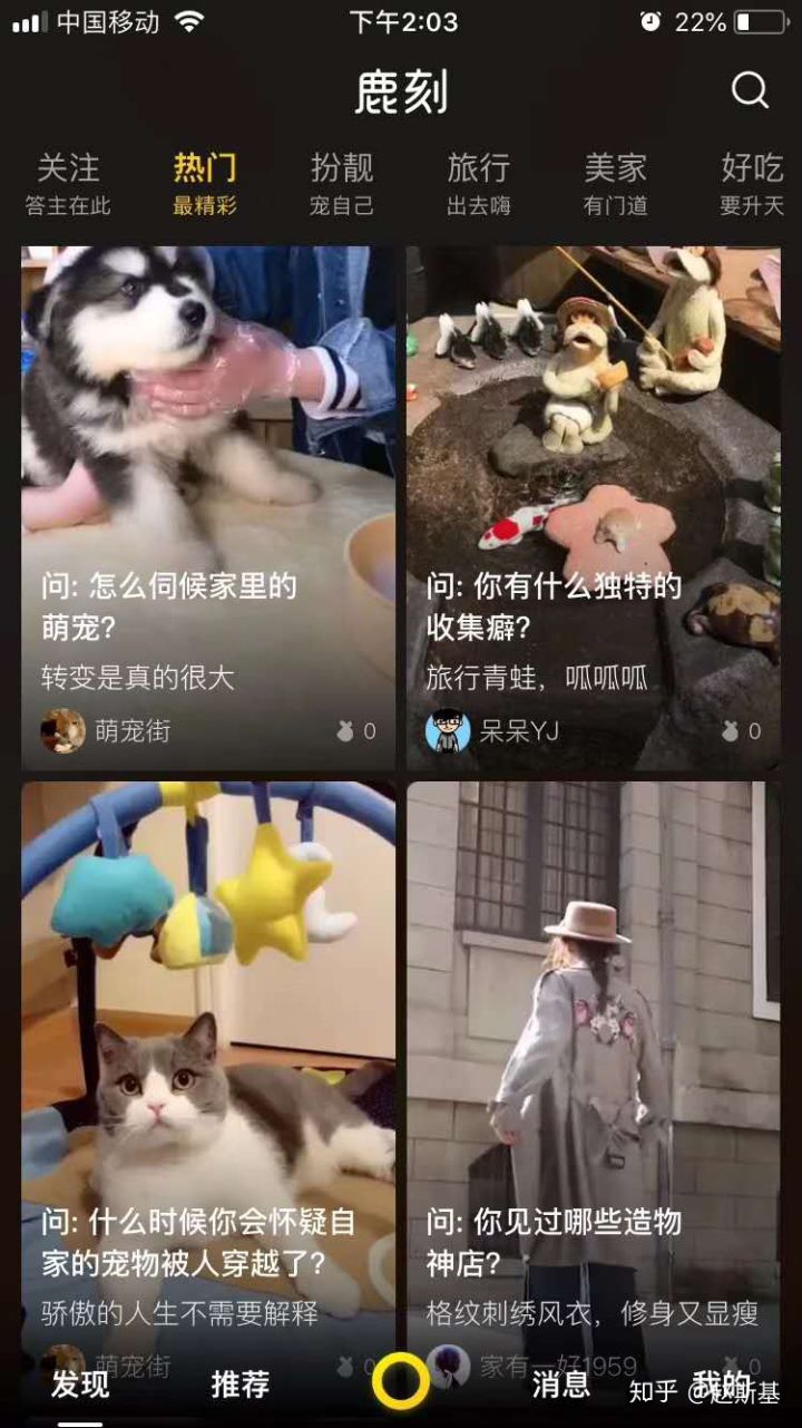 鹿刻App首页为发现页面,该页面并不是单个屏幕的界面,而是在顶部菜单栏做了类别的区分。目前,除了前两个“关注”和“热门”,其他分别是“扮靓”、“旅行”、“美家”、“好吃”、“童趣”、“萌宠”板块。App的第二个子菜单“推荐”则是沉浸式的单个屏幕展示。