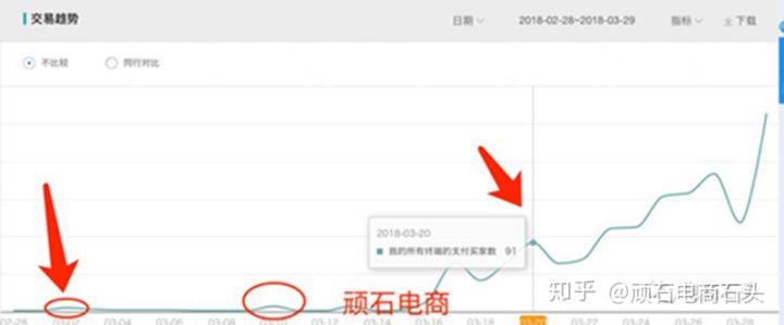 爆款的引爆:前面已经说过,淘宝的最重要判断准则在于销售额和转化率。当一个产品的流量对应销售额,转化率在新品上架28天扶持周期内呈现上升趋势时,淘宝会给给予你源源不断的流量。流量起来以后,有两个趋势。