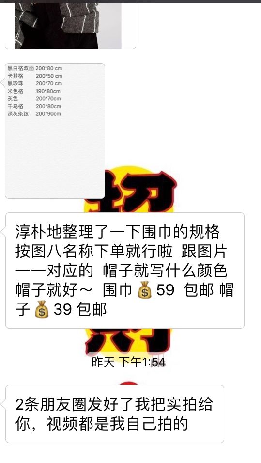 我是个不务正业的微商 无聊的时候卖卖衣服什么的 有一天这个姐姐找我 让我帮她看看能不能处理这批货 围巾59包邮 帽子39包邮 orz