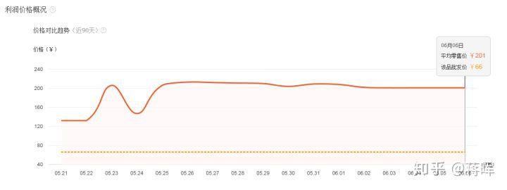 先看第一个淘零售利润,上面显示100%-200%,这数据代表在淘宝主流卖得好的店铺这款产品的售价的加价倍数,100%是加一倍,200%是加两倍。这款高腰裙的进价是64.68,也就是在淘宝零售中这款产品的主流价格是140多到200多,从这个数据可以看出这款产品在淘宝上还是有利可图的。