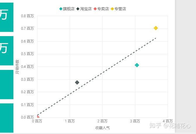 除此之外,如果我想对比一下,究竟这4种类型的店铺,哪一种店铺的收藏人气对销量的影响比较大,该怎么办呢?其实很简单,把实时排名这个维度的数据去掉即可,如图所示
