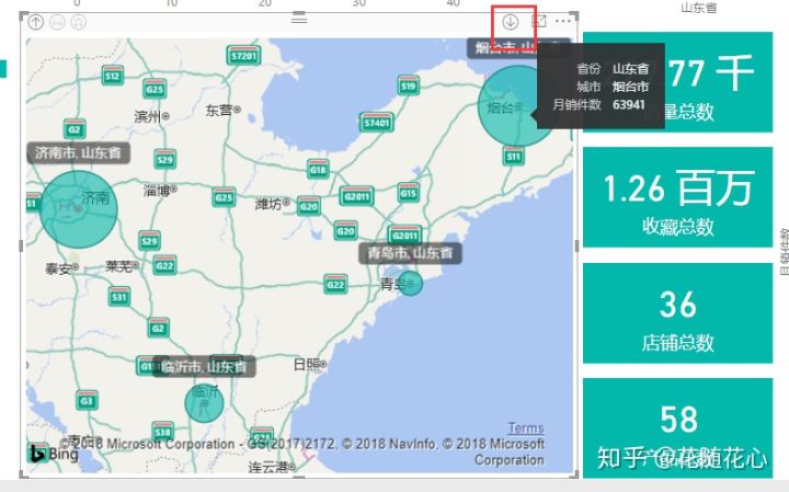 当然,我如果点击这里的红色框框按钮,就可以进入深化模式,深挖具体的城市。PBI会自动进入某一个省份里头,我们可以看出如果点击山东省的话,那么里头济南市和烟台市的贡献度最大,光烟台市的月销件数就达到63941件。