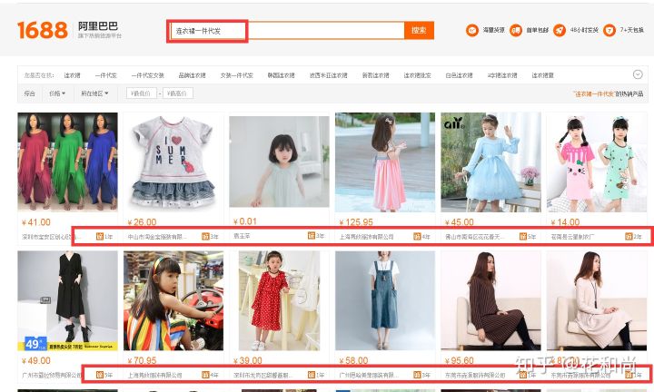首先打开阿里巴巴首页,选择供应商,输入 “ 连衣裙一件代发 ”或者“连衣裙代理”,然后在后边自动出现的关键词里面,选择一个自己认为匹配度最大最合适的就可以了,点击搜索,和淘宝一样,会出现很多代理商