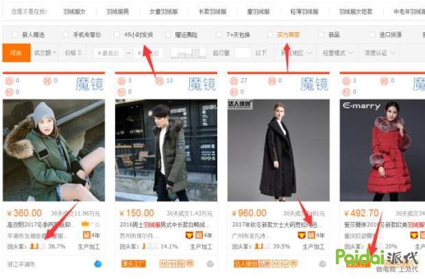 1688找货类似于淘宝,但又和淘宝不完全一样,找出爆款货源也是由很多因素决定的,以羽绒服为例,除了成交额和综合排序以外,发货时间,退换货,实力商家,回头率,以及厂家的资质等方面对于淘宝卖家都是非常重要的,毕竟你是要赚钱的,是要比一般买东西的淘宝买家要多费心思的。