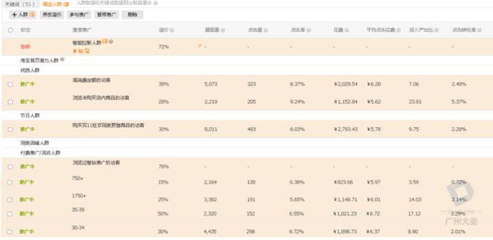 精准人群有利于获得高点击率和投产比。人群可以参考生意参谋的基础人群画像,最重要的还是要多去自定义圈定,多测试,溢价和关键词出价都是可以先统一出价,为了公平性起见,根据后面的表现进行加大/降低力度,甚至是删除,这样最终留下来的人群和定向都是最适合您的产品的人群,后续继续重点调整投入产出比高的人群,重点投入和优化