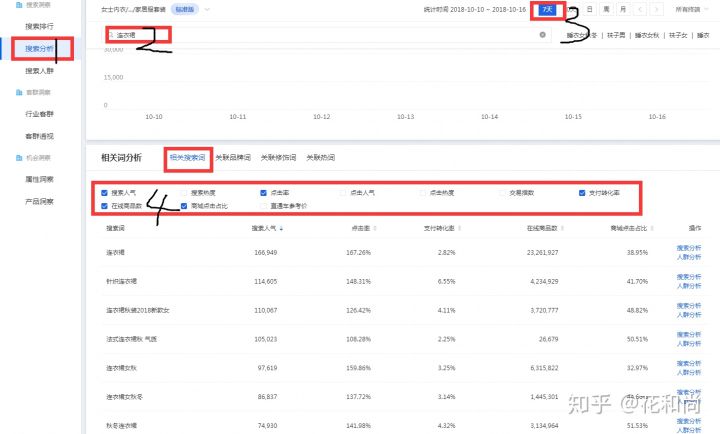 在搜索栏输入类目词,查看7天的数据,在相关搜索词部分重点关注搜索人气,点击率,转化率,在线商品以及商城占比这5个数据。