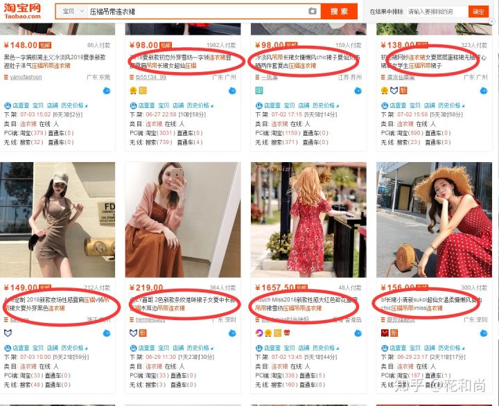 我们可以看到并不是所有的标题里都是“压褶吊带连衣裙”这几个词连在一起的。所以说我们在做标题的时候完全不用担心把关键词拆开打乱会让买家搜索这个词的时候搜索不到。这个就是顺序无关原则。