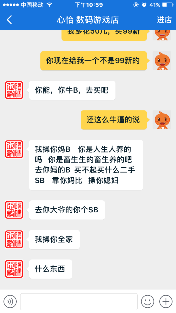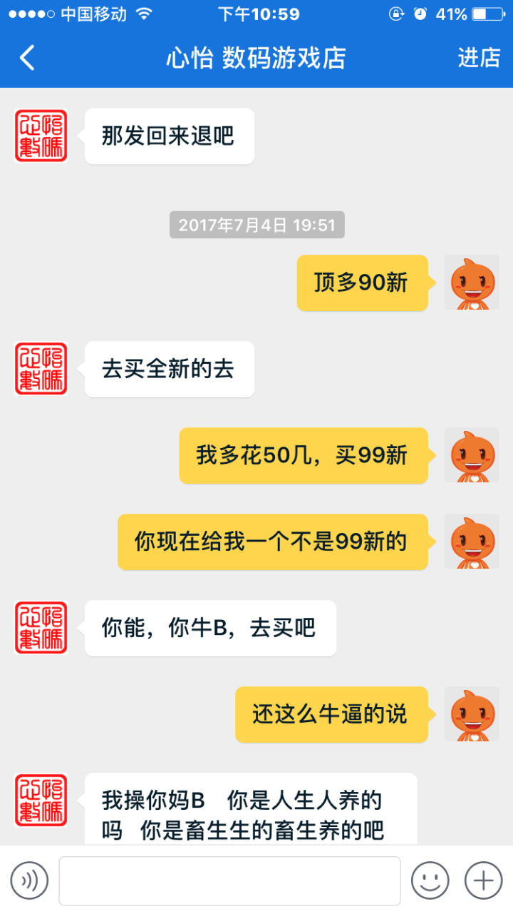 嗯,后面他又开始骂了,不过语气明显弱了,我只能说,人善被人欺,我也懒得理他了嗯,第一次遇到这样的客服,气炸了,不过对骂很没有意思,我也没有那么闲的无聊蛋疼去和他一个客服怼,就这样吧,可惜没有投诉或举报的地方了,不然我真的会投诉的。