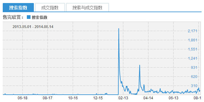 在之后的几天里,我一直在看淘宝指数的搜索数据,在我回答完问题后,关键词「售完欣赏」的搜索量从原来的几乎为零,变成现在每日约有120左右的搜索量。以下为截图: