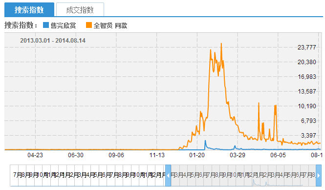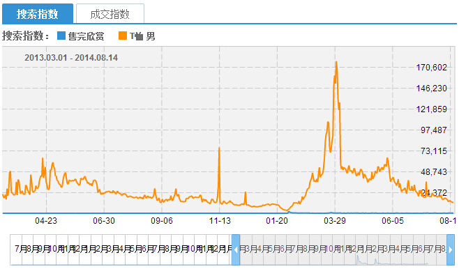 下图中,关键词「售完欣赏」在和关键词「T恤 男」比较之后,是显得那么微不足道,甚至我们都已经看不见它的起伏。