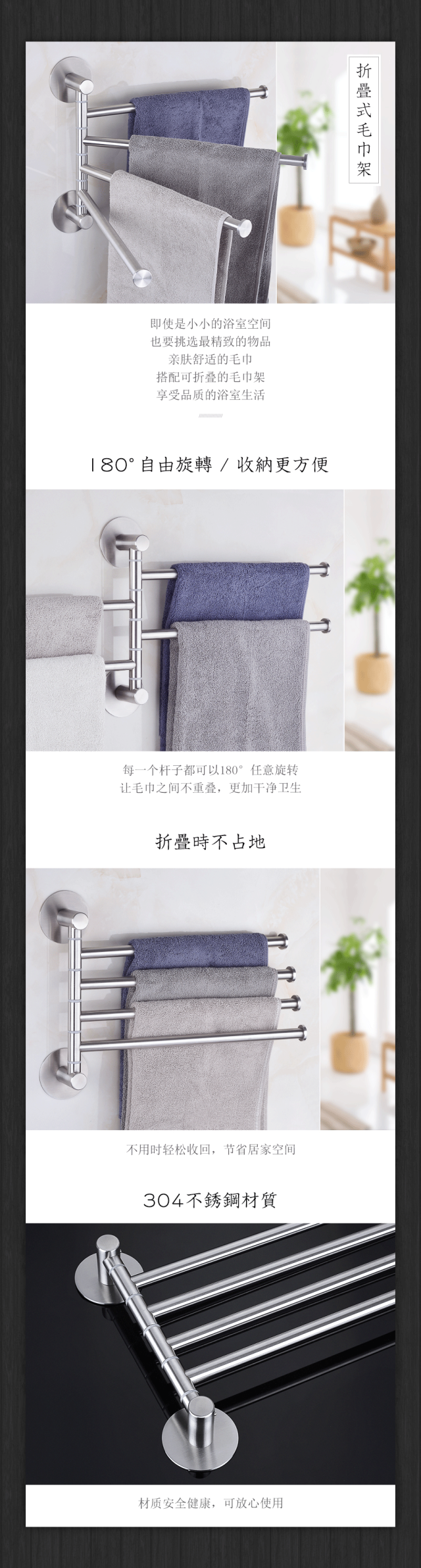 主题:折叠式毛巾架(5) 即使是小小的浴室空间也要挑选最精致的物品亲肤舒适的毛巾搭配可折叠的毛巾架享受品质的浴室生活 180°自由旋转,收纳更方便(5)每一个杆子都可以180°任意旋转让毛巾之间不重叠,更加干净卫生 折叠时不占地(5)不用时轻松收回,节省居家空间 304不锈钢材质(6)材质安全健康,可放心使用……