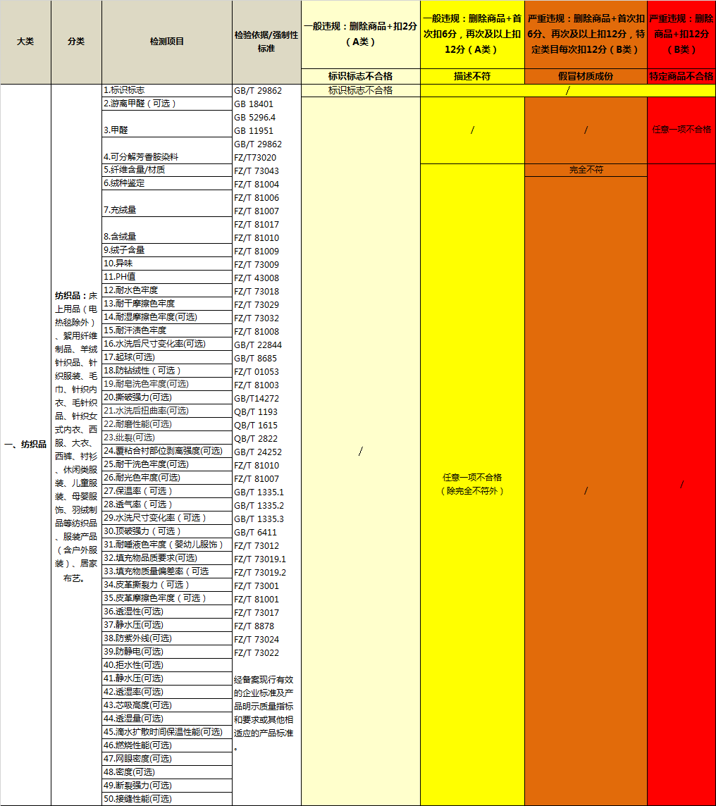 淘宝抽检标准(纺织、服装)