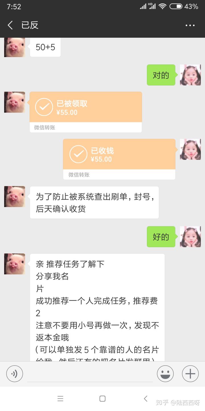 刷单真确实是真的,只是也存在骗子,但是刷单只要记住一点,凡是除了让你按淘宝正常下单流程的方法以为付钱的全都不要做,别听别人说的佣金再高也不做,只要正常买东西下单你都不用担心被骗,因为你是可以申请退款的我之前一直想做能靠劳动就能赚钱的兼职,然后就在知乎搜了好多,每次都想私信楼主一起做,但是怕被骗了(因为我真的被骗了好多钱好多次)就连我一闺蜜做刷单一年了,我咨询过好多次我都不敢加入,特别是听到了要会费,那是真的不敢,哪怕和闺蜜感情再好,后来前前后后我闺蜜都被我问烦了总之后来我就是抱着再被骗钱了就再也不做兼职的心态加入的,平台费是有的,不是闺蜜赚的,只不过她带了我进去她有奖励,后来我闺蜜也把奖励给我了,现在我做了一个多月,业余通过刷单也赚了快两千了,然后由于内疚(问了很多次闺蜜,就是不放心,最后闺蜜把平台奖励她的钱都退给我了,相当于她都没赚钱)所以现在我赚到钱了,平台是靠谱的,平台费本金也都回来了,我也就给闺蜜发了个52的红包,心里确实过意不去,给你们看几张图片吧大概就是刷单的整个过程