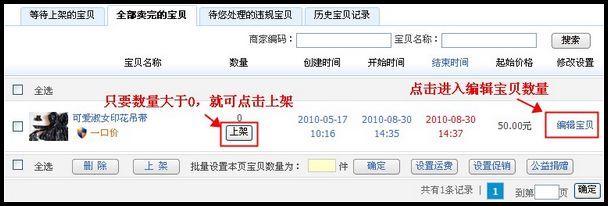 宝贝被拍完下架后如何重新上架? 大文 四月 2, 2016 商品管理 0 条评论 2256 围观 如果某宝贝发布时共有10件,待10件都被拍完,该宝贝会自动进入“卖家中心”—“宝贝管理”—“仓库中的宝贝”—“全部卖完的宝贝”中。 如果您又有货了,可以“编辑宝贝”数量后点击“上架”(如图)。